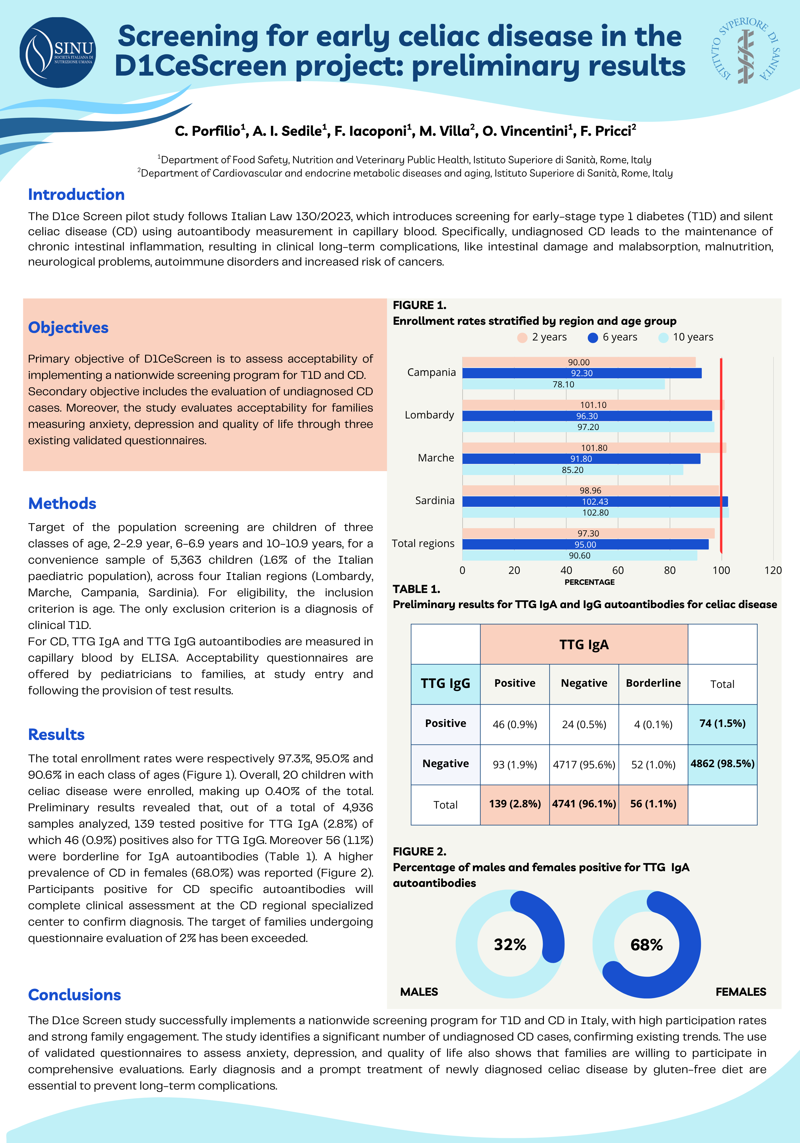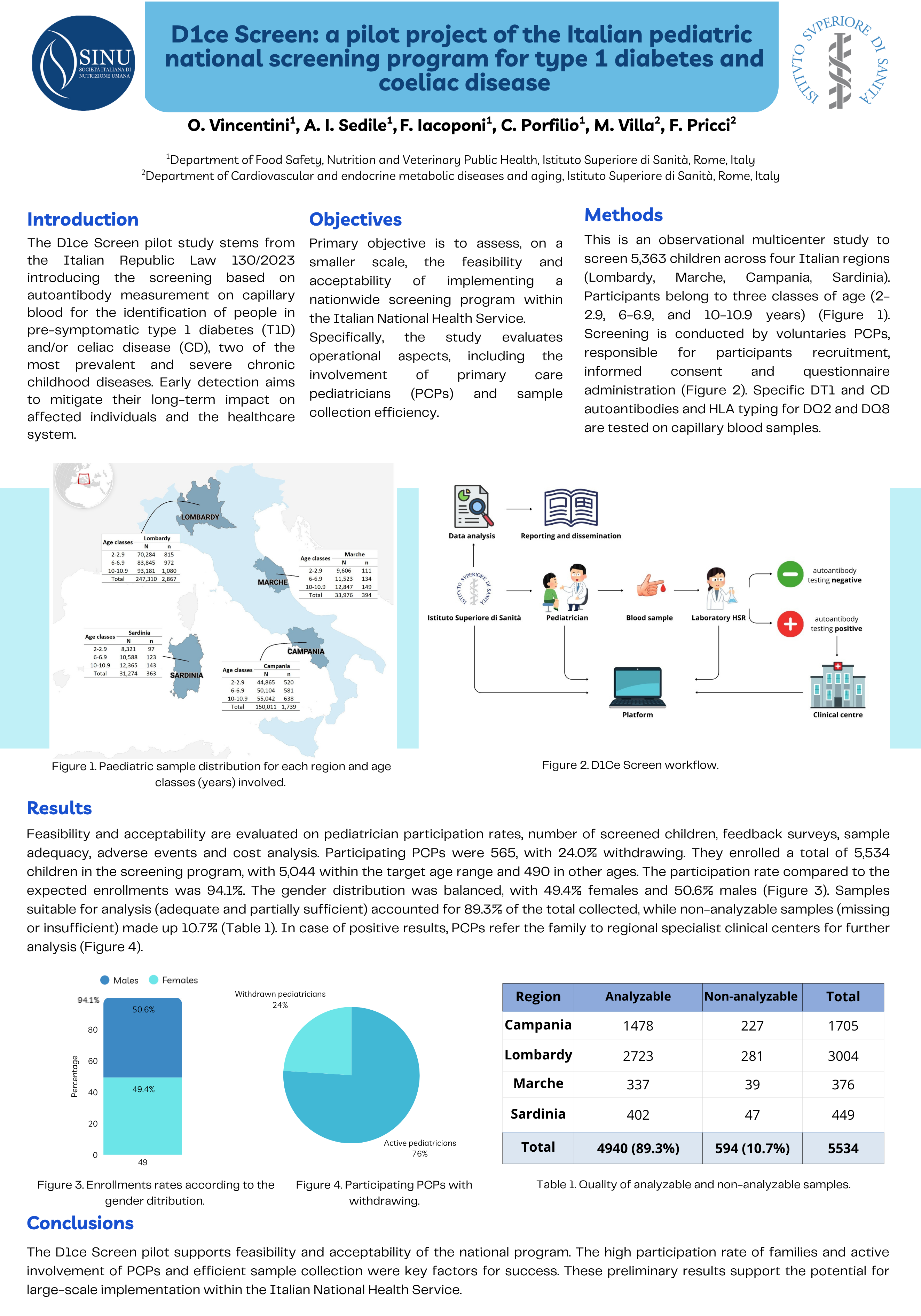 - 45° Congresso Nazionale SINU 2025. D1Ce Screen: a pilot project of the italian pediatric national screening program for type 1 diabetes and coeliac disease. O. Vincentini, A. I. Sedile, F. Iacoponi, C. Porfilio, M. Villa, F. Pricci. Poster