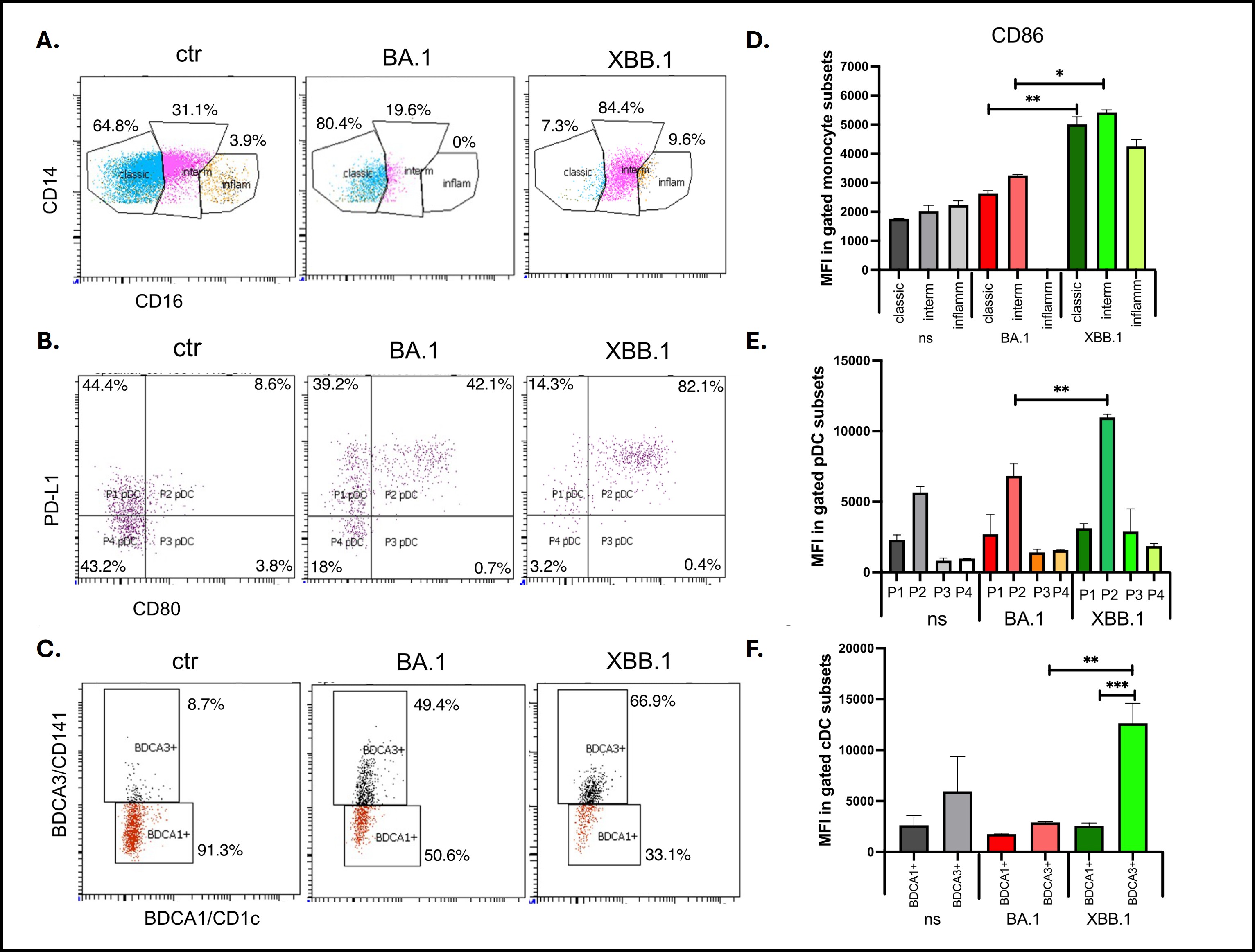 and conventional dendritic cells (cDC) (C) were analyzed in PBMC exposed to Omicron BA.1 and Omicron XBB.1.