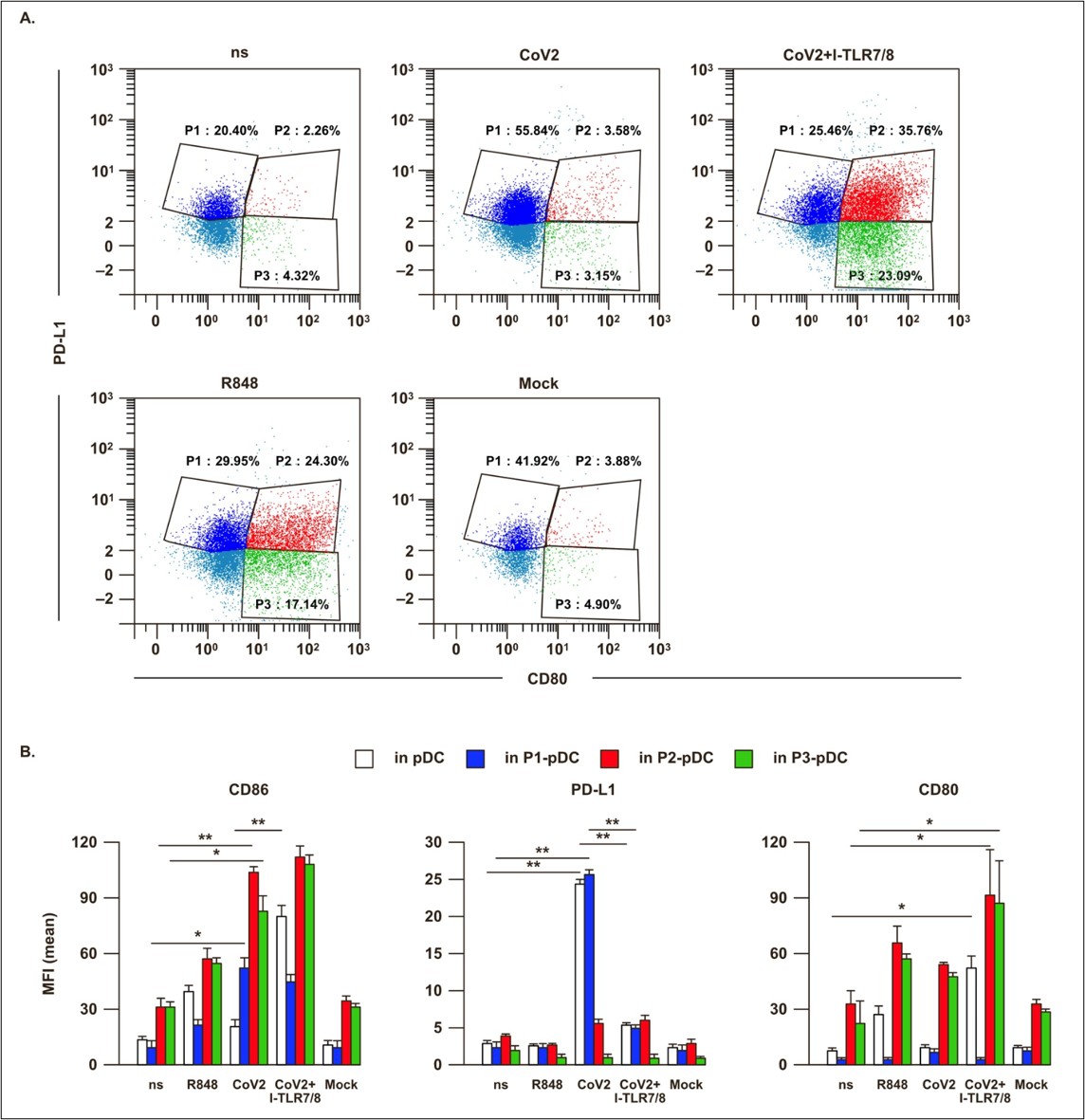(A) pDC were then stained with anti-BDCA4, PD-L1, CD80 and CD86 antibodies. The percentage (%) of pDC sub-populations was evaluated by flow cytometry in live/single BDCA4+ pDC; in particular P1-pDC (PD-L1+CD80-, in blue), P2-pDC (PD-L1+CD80+, in red) and P3-pDC (PD-L1-CD80+, in green).