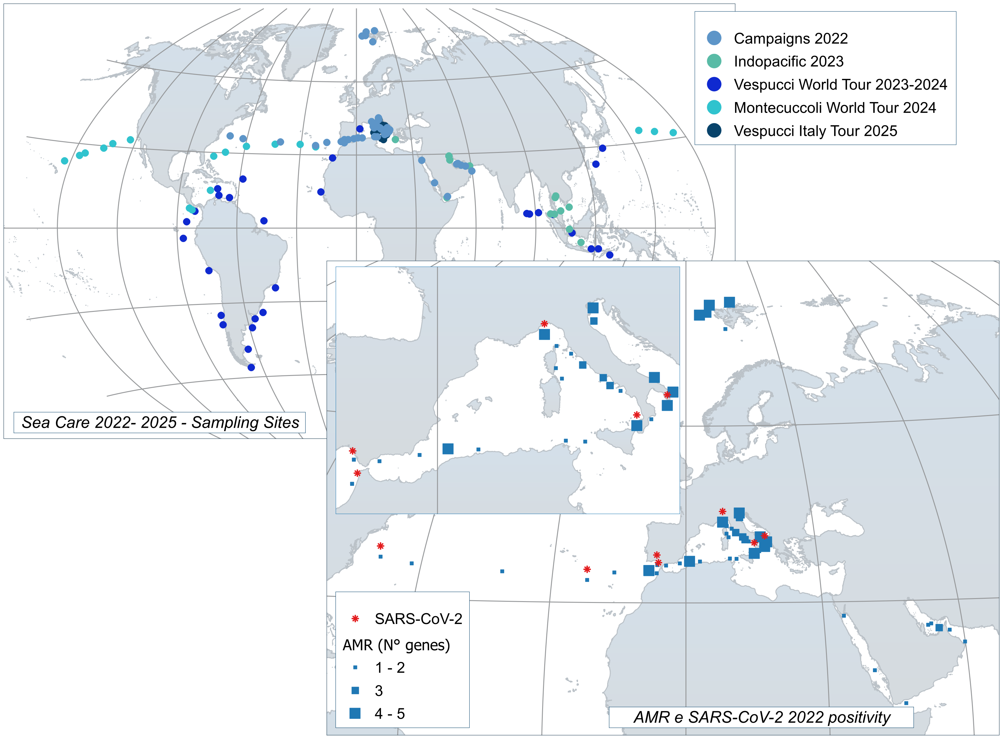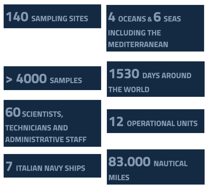 The choice of sampling sites sought to take into account the most important of these factors through the analysis of available satellite data; currents were analysed from Copernicus Marine Service and Earth nullschool; anthropogenic impacts were studied through several platforms such as EMODnet, and The Global Wastewater Model which maps nitrogen inputs from wastewater systems, Marine Traffic for the study of merchant vessel traffic; TheOceanCleanUp for mapping plastic spills from rivers. The frequency of the sampling has been set on an annual basis and it is linked to the routes of the Italian Navy vessels.