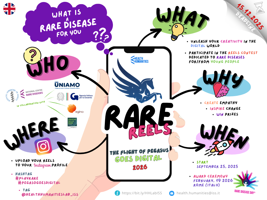 Il 25 settembre ’25, nell’ambito della Creative Skills Week a Praga, parte la nuova edizione di "RARE REELS: Pegaso goes digital!", il concorso promosso dall’Istituto Superiore di Sanità, attraverso il Laboratorio di Health Humanities del Centro Nazionale Malattie Rare, UNIAMO Federazione Italiana Malattie Rare, Agenzia Italiana per la Gioventù, EGInA e il network della Creative Skills Week.