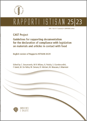 Rapporto ISTISAN 25/23 - Project CAST. Guidelines on supporting documentation to declaration of compliance to the legislation on materials and articles intended to come into contact with food. English version of Rapporto ISTISAN 24/29. Edited by Cinzia Gesumundo, Maria Rosaria Milana, Giorgio Padula, Silvia Giamberardini, Fabiana Vanni, Marco De Felice, Massimo Denaro, Roberta Feliciani, Michele Massara, Veruscka Mannoni
