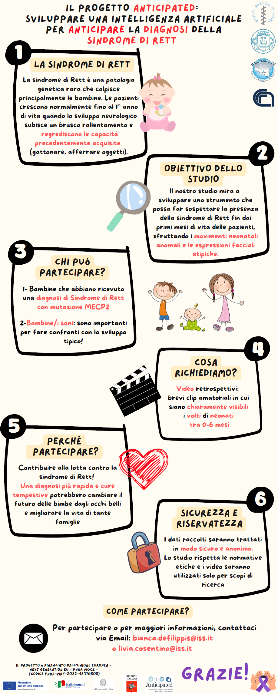 Utilizzare tecniche avanzate di intelligenza Artificiale (IA) per riconoscere, fin dai primi mesi di vita, gli impercettibili segnali della sindrome di Rett, una rara malattia genetica che viene generalmente diagnosticata fra i due e i tre anni d’età. È l’obiettivo del progetto ‘Anticipated’, che ora ha bisogno dell’aiuto di tutti: al fine di insegnare all’IA come riconoscere i comportamenti atipici durante lo sviluppo post-natale, i ricercatori stanno promuovendo una campagna di raccolta di video amatoriali retrospettivi di neonate/i fino a sei mesi di età, sia sane/i che con diagnosi di sindrome di Rett.