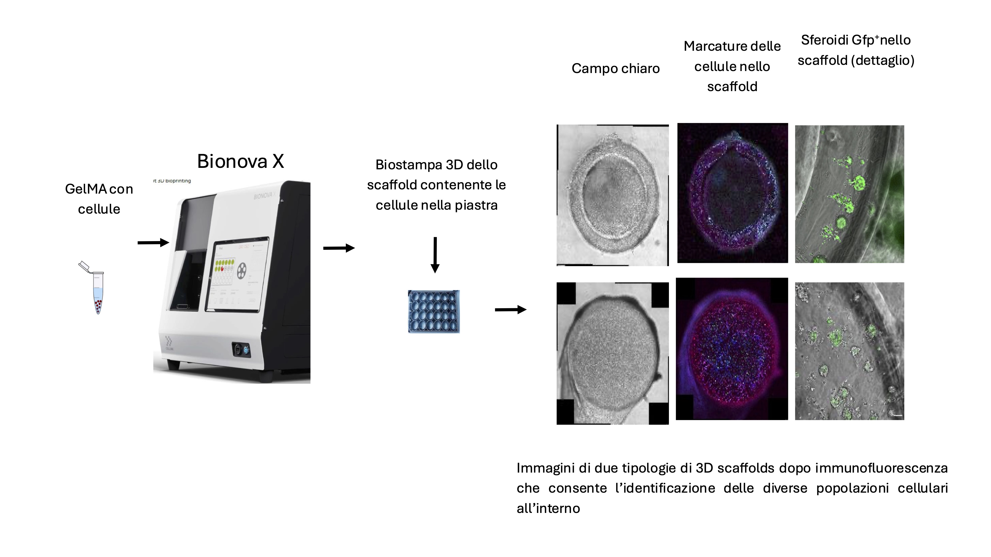 La Bionova X è una stampante 3D per biotecnologie ad alta risoluzione con tecnologia Digital Light Processing (DLP), progettata per realizzare costrutti per ingegneria tissutale in 3 dimensioni. Il bioinchiostro (GelMA, gelatin methacrylate, nel nostro caso) e le cellule sono miscelati ed esposti a radiazione nell’ultravioletto (405 nm), secondo uno schema definito dall’utente, in modo da realizzare una opportuna reticolazione, con risoluzione di stampa pari a 10 mm. Le cellule vengono pertanto biostampate in scaffolds su piastre da 6, 12, 24 o 96 wells e tenute secondo le appropriate condizioni di coltura.
