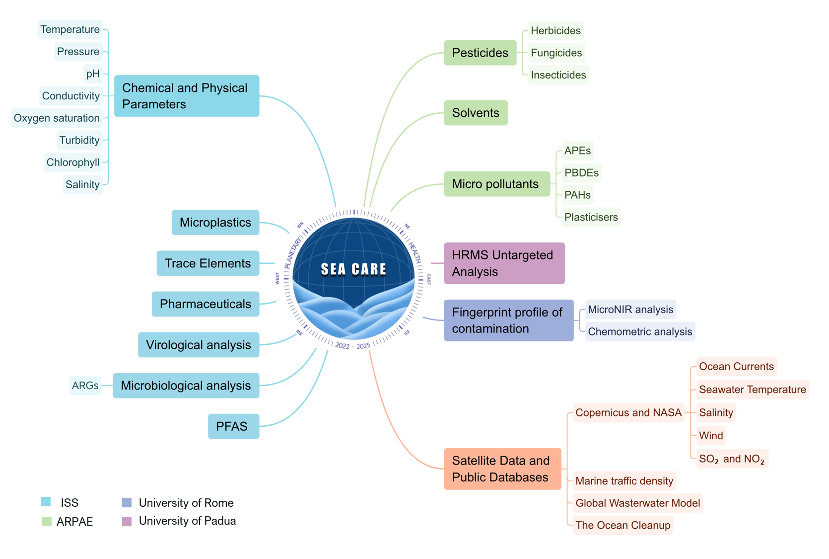 Le sostanze chimiche selezionate per lo studio appartengono a diverse classi di contaminanti dell'ambiente marino pericolosi e persistenti . Si tratta di elementi chimici (il cui rapporto isotopico può fornire prove della presenza naturale o antropica), composti perfluoroalchilici (PFAS), pesticidi, idrocarburi, interferenti endocrini, farmaci, tensioattivi e microplastiche. Sono stati selezionati in base a quattro criteri: 1) molecole pericolose e persistenti nelle acque e nell'ambiente marino; 2) sostanze che sono prodotte e distribuite in modo massiccio, soprattutto se non vengono fissati limiti allo scarico; 3) sostanze che hanno effetti diretti o indiretti sulla salute; 4) presenza di lacune nelle conoscenze.​