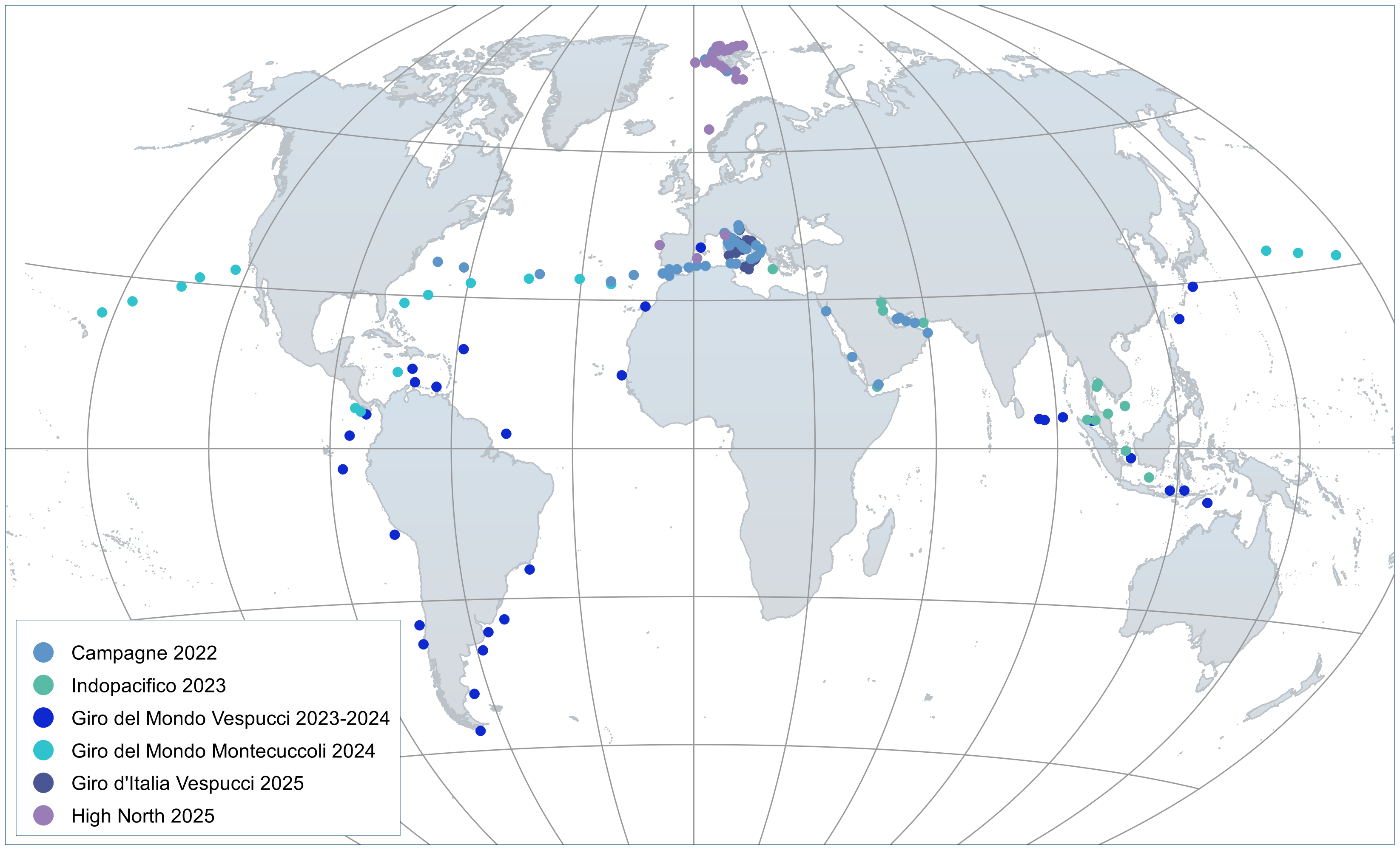 La selezione delle aree di campionamento si è basata sui seguenti criteri: 1) direzione delle correnti marine; 2) mappatura delle fonti di impatto antropico lungo la costa in funzione del carico organico; 3) direzione e intensità del traffico marittimo; 4) parametri chimici e fisici in grado di influenzare la distribuzione degli inquinanti nell'ambiente marino (ad esempio salinità, temperatura, pH); 5) disponibilità e allocazione ottimale delle risorse. La scelta dei siti di campionamento ha cercato di tenere conto dei fattori più importanti attraverso l'analisi dei dati satellitari disponibili; le correnti sono state analizzate dal Copernicus Marine Service e da Earth nullschool; gli impatti antropici sono stati studiati attraverso diverse piattaforme come EMODnet e The Global Wastewater Model , che mappa gli apporti di azoto dai sistemi fognari, Marine Traffic per lo studio del traffico delle navi mercantili e TheOceanCleanUp per la mappatura delle immissioni di plastica dai fiumi. La frequenza del campionamento è stata fissata su base annuale ed è collegata alle rotte delle navi della Marina Militare Italiana.