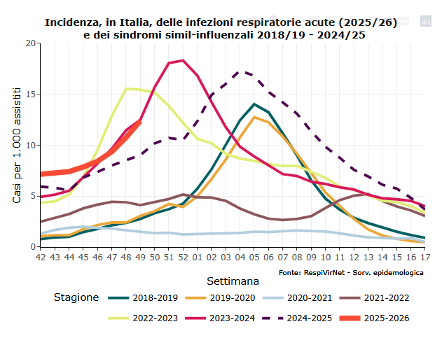 L’incidenza totale delle infezioni respiratorie acute nella comunità, nella settimana dall'1 al 7 dicembre, è stata pari a 12,4 casi per 1.000 assistiti (vs 10,2 nel bollettino precedente), in aumento rispetto alla settimana precedente come atteso per il periodo. Sono stati stimati circa 695mila nuovi casi, con un totale dall'inizio della sorveglianza di circa 4 milioni di casi. L’incidenza più elevata si osserva, come di consueto, nella fascia di età 0-4 anni, con circa 38 casi per 1.000 assistiti.. Lo afferma il rapporto della sorveglianza RespiVirNet, pubblicato oggi e da quest’anno in forma interattiva.