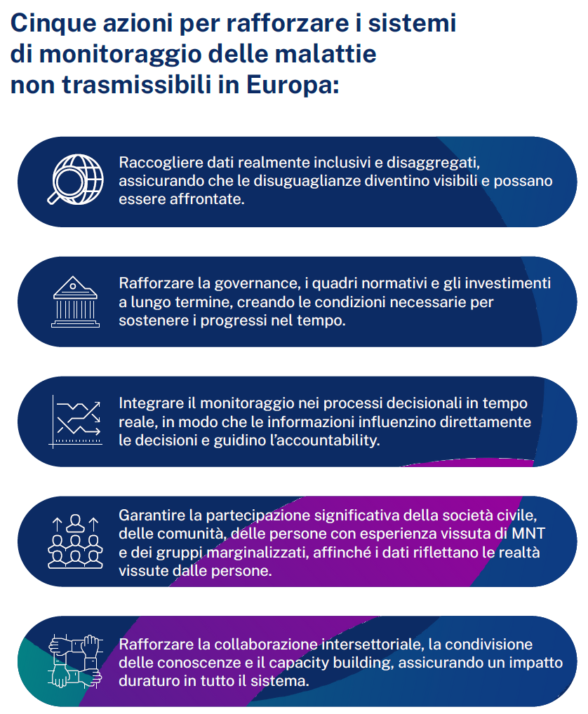 Viene sottolineato come, troppo spesso, le attività di monitoraggio delle MNT siano state condotte occasionalmente, facendo affidamento su finanziamenti esterni o sull’iniziativa di singoli promotori, determinando una copertura disomogenea, scarsa comparabilità tra i Paesi e persistenti lacune nella conoscenza dello stato di salute di gruppi che vivono in condizioni di vulnerabilità, come migranti, minoranze e persone con disabilità.